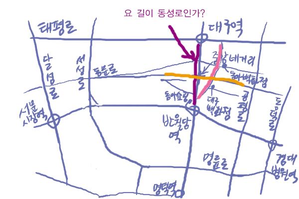 아,,,햄,,,이거 올리고 말씀하셨구나,,,난 못보고 말씀드린건데,,, 보라색부분이 동성로 맞습니다,,,^^ 글쿠,,,어여,,,자삭하시길,,,ㅡㅡ^