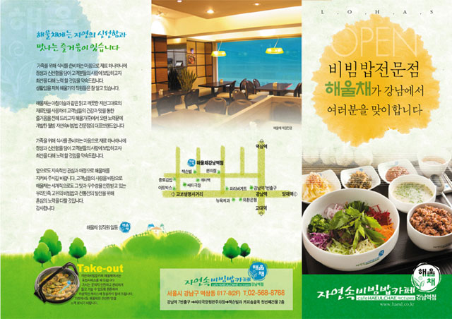 왼쪽위 copy괜찮지않나요? ㅎㅎ "해울채에는 자연의 신선함과 만나는 즐거움이 있습니다" "해울채에는 자연의 신선함과 맛나는 즐거움이 있습니다" 단어 하나로 두가지 의미를 강조하는....ㅋㅋ